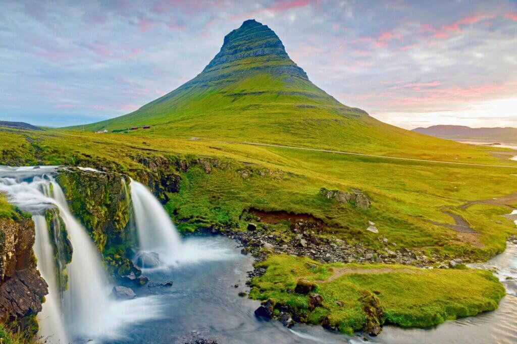 Der Kirkjufell, Islands meistfotografierter Berg, erhebt sich mit seiner markanten Kegelform direkt an der Nordküste der Halbinsel Snæfellsnes. Vom Aussichtspunkt aus siehst du den 463 Meter hohen Berg in seiner charakteristischen Form, die ihm den Namen ‚Kirchenberg‘ eingebracht hat. Im Vordergrund rauscht der Kirkjufellsfoss, ein mehrstufiger Wasserfall, dessen Kaskaden das perfekte Komplementär zur spitzen Bergsilhouette bilden. Besonders eindrucksvoll zeigt sich diese Kulisse in den Abendstunden, wenn die tiefstehende Sonne den Berg anstrahlt, oder in klaren Winternächten, wenn Nordlichter über dem Gipfel tanzen.