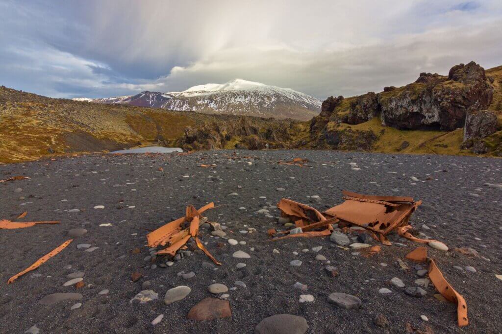 Am Djúpalónssandur Beach erlebst du eine von Vulkanismus geprägte Küstenlandschaft mit schwarzem Kieselstrand, zerklüfteten Lavaklippen und bizarren Felsformationen wie dem Gatklettur-Felsbogen. Die Brandung ist hier oft rau, die Wellen brechen kraftvoll auf das dunkle Gestein. Am Strand liegen verrostete Wrackteile des 1948 gesunkenen britischen Trawlers Epine, ein stummes Zeugnis der Gefahren dieser Gewässer. Der Strand ist bekannt für die sogenannten ‚Lifting Stones‘, vier große Steine, die früher von Fischern zur Kraftprobe verwendet wurden.