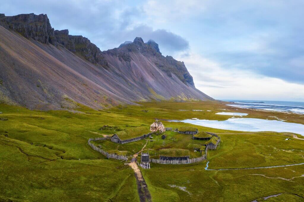 Das Stokksnes Viking Village, nahe der Stadt Höfn in Südisland, ist eine faszinierende Filmkulisse, die ursprünglich um die 2000er Jahre von einem isländischen Filmemacher errichtet wurde. Obwohl der Film nie fertiggestellt wurde, zieht das nachgebaute Wikingerdorf zahlreiche Besucher an, die das isländische Wikingerleben entdecken möchten. Die Kulisse besticht durch ihre Detailtreue und versetzt die Besucher in vergangene Zeiten. Umgeben von der dramatischen Küstenlandschaft und dem imposanten Vestrahorn-Berg bietet das Dorf eine beeindruckende Szenerie für Hobbyfotografen und Geschichtsinteressierte.