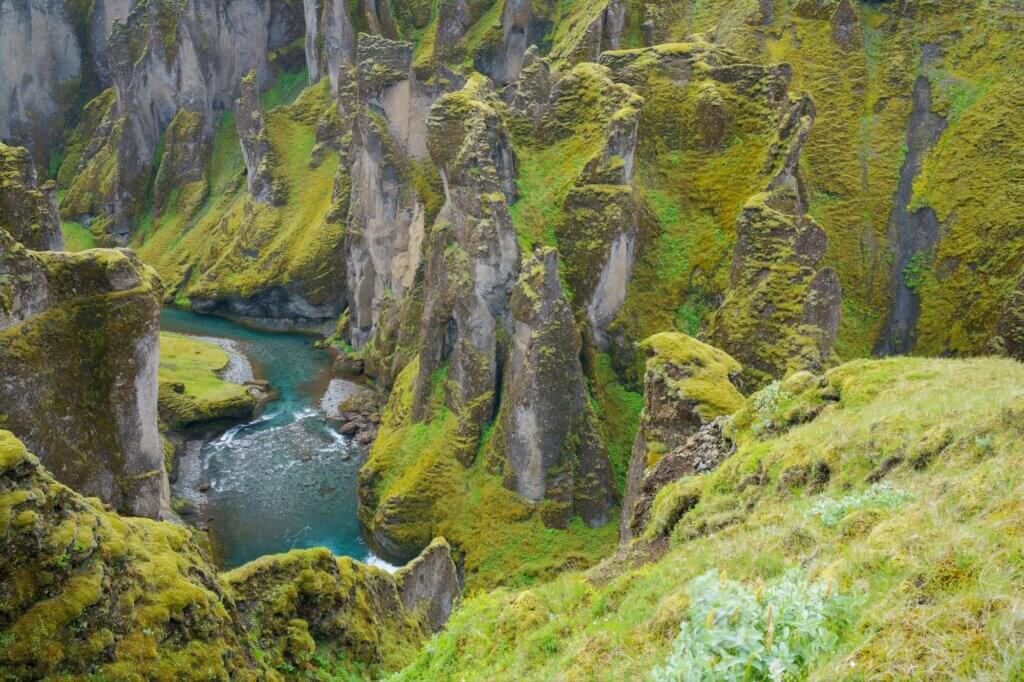 Der Fjaðrárgljúfur Canyon in Südisland ist ein Wunder der Natur, geformt durch Schmelzwasser vor etwa 9000 Jahren. Die Schlucht erstreckt sich über 2 Kilometer und beeindruckt durch dramatische Felsformationen und eine üppige, moosbedeckte Vegetation. Von den Wanderwegen entlang der Schlucht eröffnet sich eine spektakuläre Sicht auf die schroffen Formationen und tiefen Abhänge. Besonders beeindruckend ist der Blick auf den majestätischen Wasserfall am Ende des Pfads.