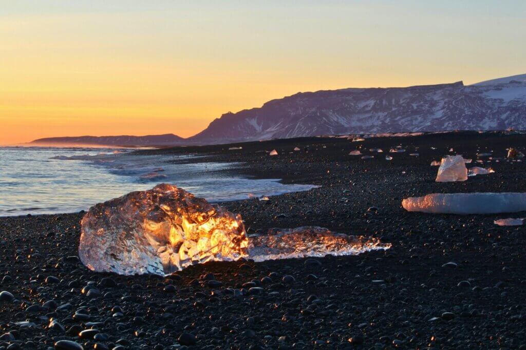 Erlebe schwarzen Sandstrand übersät mit Eisdiamanten