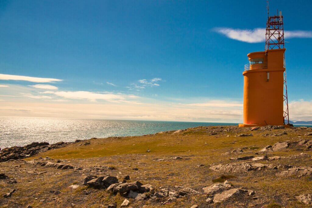 Der Hvalnes Lighthouse ist ein markanter, orangefarbener Betonleuchtturm an der Ostküste Islands in der Region Südisland. Gebaut im Jahr 1954, erhebt er sich 11,5 Meter hoch über eine beeindruckende vulkanische Landschaft und bietet eine spektakuläre Aussicht auf Küstenlinie und Berge. Der knallig orangefarbene Turm steht in perfektem Kontrast zum schwarzen Kiesstrand und den beeindruckenden Felsformationen der Umgebung. Neben der grandiosen Aussicht ist die Region auch Heimat zahlreicher Küstenvögel, die oft im Gebiet nisten.