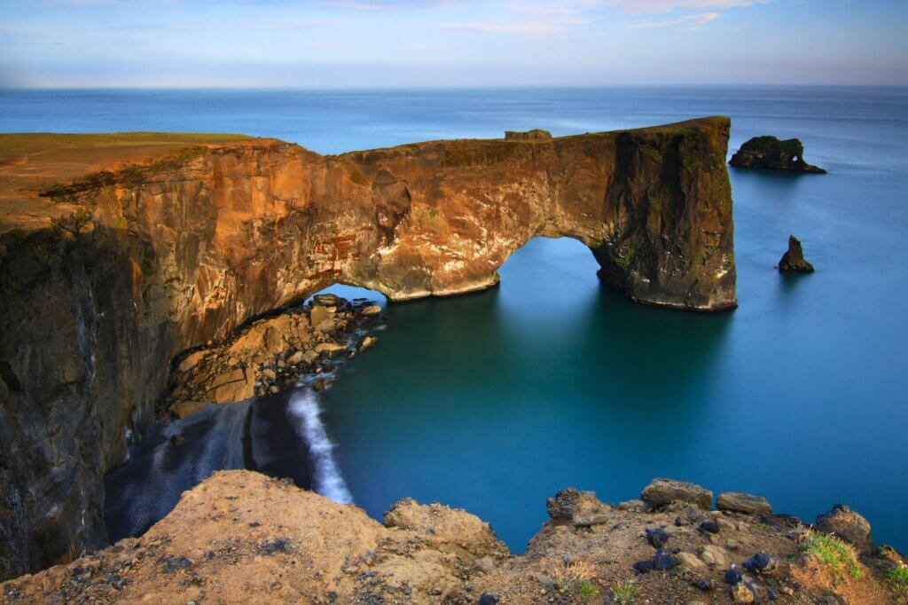 Der Dyrhólaey Aussichtspunkt bietet einen spektakulären Blick über die dramatische Küstenlandschaft Südislands. Von hier aus kannst du die atemberaubende Weite der schwarzen Sandstrände genießen, die im Kontrast zur weißen Brandung des Atlantiks stehen. Besonders beeindruckend sind die markanten Felsformationen und der große, durch Erosion entstandene Felsbogen, der dieser Landzunge ihren Namen gibt. An klaren Tagen reicht der Blick bis zum mächtigen Mýrdalsjökull-Gletscher.
