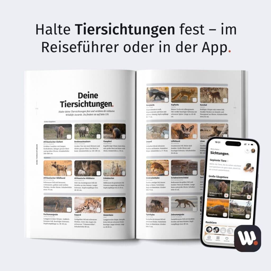 - Spüre die Tiere selbst auf: Dank konkreter Tierbeobachtungstipps und detaillierter Karten musst du kein Safari-Experte sein, um unglaubliche Tiersichtungen zu erleben. Mit dem Wildlife Viewing Board kannst du sie für die Ewigkeit festhalten.