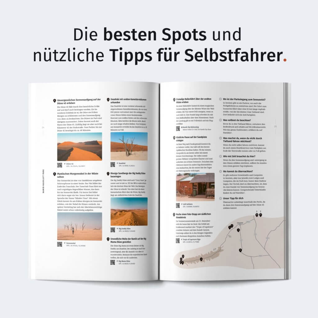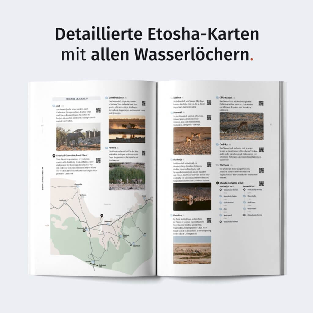 - Auf eigene Faust durch Namibia: Mit detaillierten Karten zu den Nationalparks und nützlichen Planungstipps fühlst du dich auch als Selbstfahrer immer gut vorbereitet – egal in welche Region es dich verschlägt.