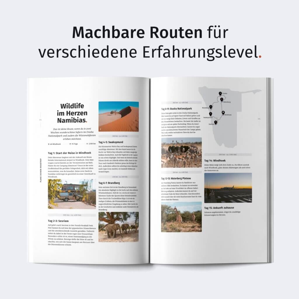 - Ideal auch für Namibia-Erstreisende: Finde Routen auch ohne Tiefsandfahrten und Antworten auf häufige Fragen bekommen. So fühlst du dich gut vorbereitet und kannst deine Namibia-Rundreise mit einem sicheren Gefühl erleben.