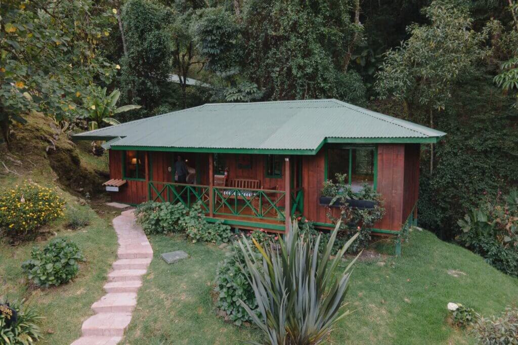 Die Lodge liegt abgeschieden in einem grünen Hochtal auf über 2.200 Metern Höhe, umgeben von dichtem Nebelwald, moosbedeckten Bäumen und glasklaren Bergbächen.
